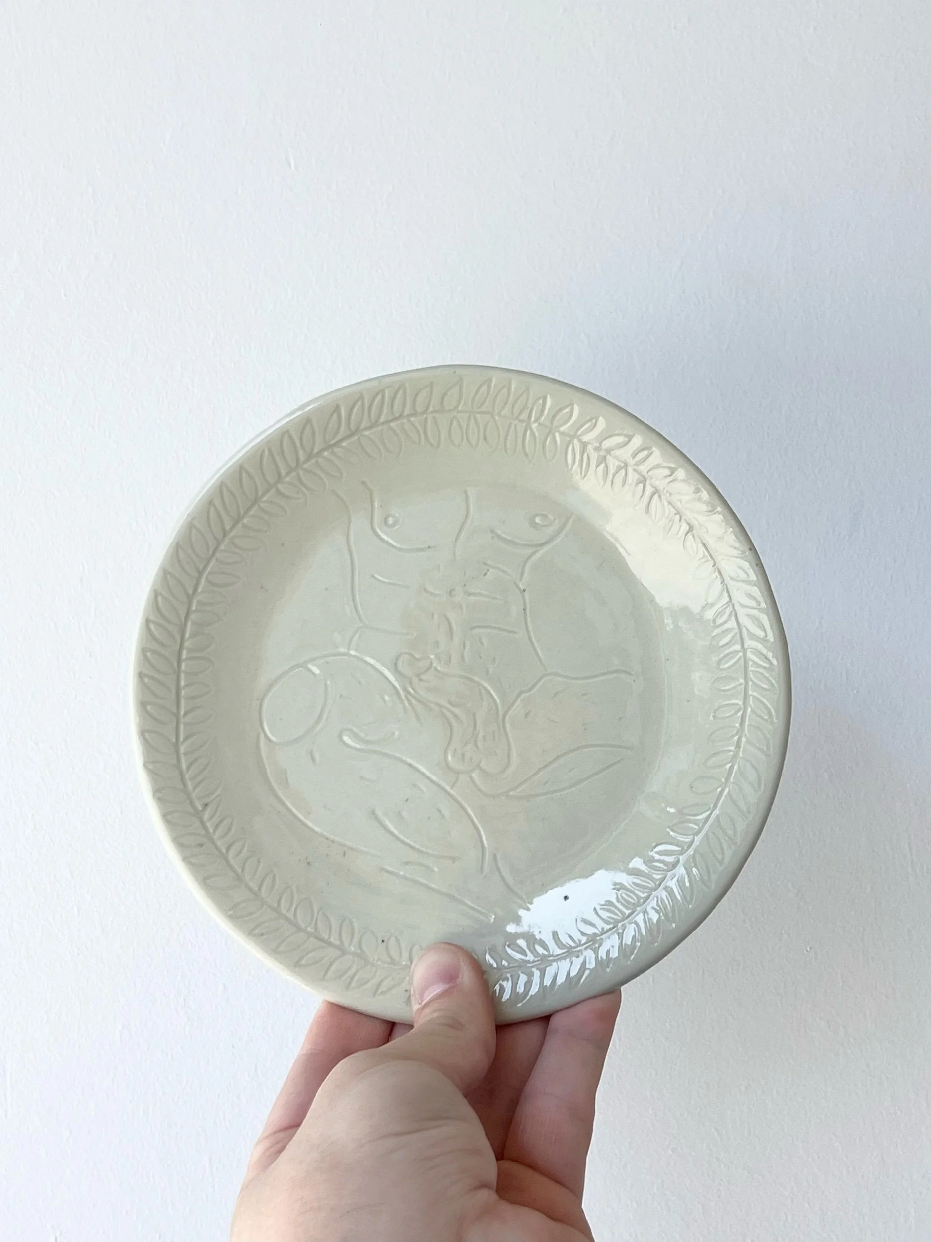 This handmade side plate features a delicately carved illustration of a reclining male figure, stretched out among leaves and framed by a hand-tooled border. The soft, pale glaze highlights the incised lines, giving the piece a subtle yet sensual presence.